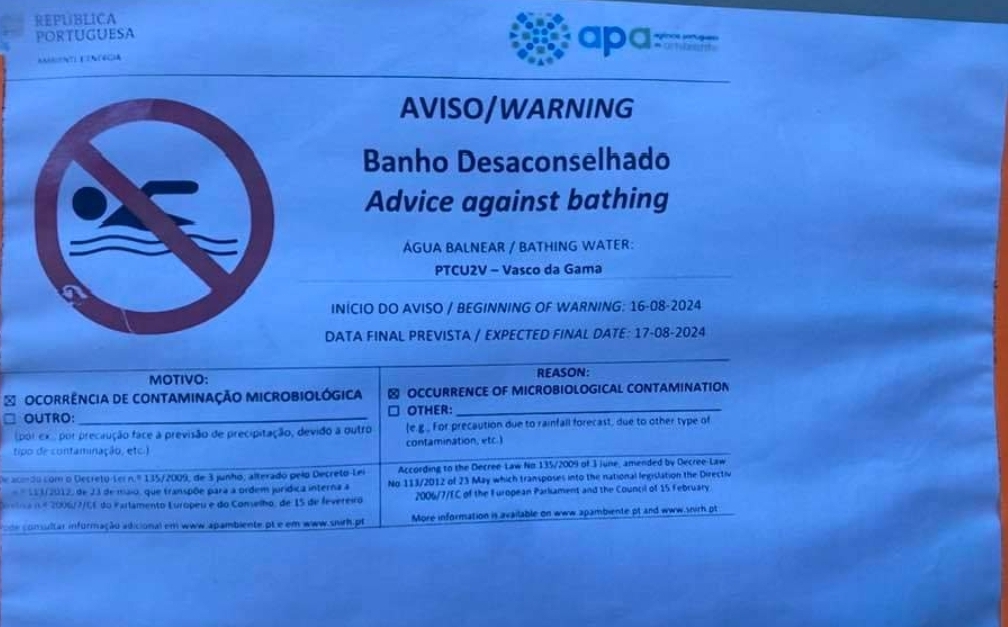 No site da APA – Agência Portuguesa do Ambiente, encontra-se um aviso ( Que ainda não foi rectificado no site no que concerne à data), que desaconcelhou banhos na Praia Vasco da Gama em Sines.