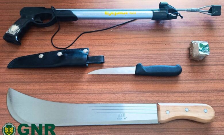 Durante a operação, foi realizada uma busca domiciliária, na qual foram apreendidas 92 doses de haxixe, uma catana, uma arma de caça submarina e uma faca do mesmo tipo — armas consideradas ilegais fora do contexto próprio de uso.