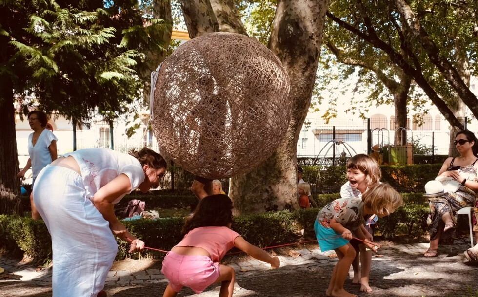 in do é um quarteto para três corpos-bola e um corpo humano. É uma dança-viagem que conversa com o vento, com a inclinação da rua, com o coração de quem passa ou vem ao encontro. Pessoas de muitas idades juntas. Pelo caminho aparecem fios que tecem histórias, fios que destapam mistérios escondidos e esquecidos e guardados em cantos e brechas.in do faz-se dança indo, confiando que o mundo e os mundos querem existir dançando entre a terra e o céu.Agora que o mundo acabou, podemos dançar-brincar?