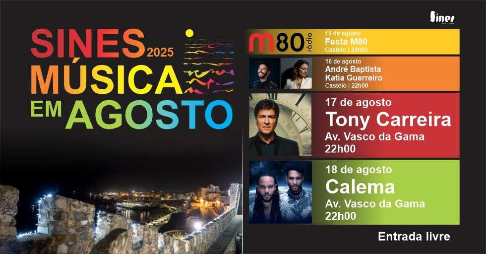 Na época tradicional das festas da cidade, Sines vive um Agosto musical, com música popular de vários estilos, para vários gostos e para várias gerações. O programa de “Música em Agosto”, com entrada 100% livre, está dividido entre o Castelo e a Avenida Vasco da Gama, com os espectáculos a iniciarem-se sempre às 22h00.