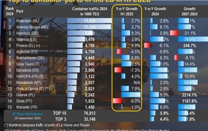 O porto de Sines manteve, no 1° semestre deste ano, o 14.º posto no ranking europeu dos principais portos de contentores, elaborado pelo especialista belga Theo Notteboom. Contudo, a infraestrutura enfrentou a maior quebra homóloga entre os seus pares: movimentou 1,93 milhões de TEU, menos 9% do que no mesmo período do ano passado.