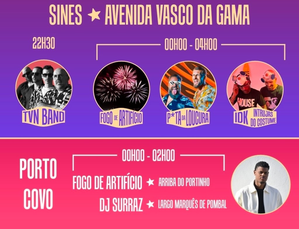 Em Sines, as comemorações decorrem na Avenida Vasco da Gama, com início marcado para as 22h30. A noite arranca com um concerto da TVN Band, com um repertório de covers, seguindo-se o tradicional fogo de artifício à meia-noite. A animação prolonga-se pela madrugada com os espectáculos de P*ta da Loucura e IDK – Intrujas do Costume, garantindo música e ambiente festivo até às primeiras horas de 2026.