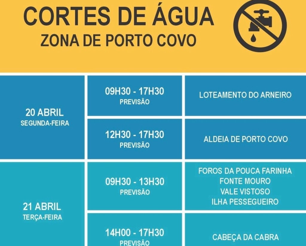 Segundo a informação divulgada pelo município, os trabalhos poderão implicar cortes temporários no abastecimento de água, em períodos distintos, consoante as áreas abrangidas. No dia 20 de Abril, segunda-feira, está previsto um corte entre as 09h30 e as 17h30 no Loteamento do Arneiro. Nesse mesmo dia, a Aldeia de Porto Covo deverá registar interrupção no abastecimento entre as 12h30 e as 17h30. Já no dia 21 de Abril, terça-feira, a previsão aponta para cortes entre as 09h30 e as 13h30 em Foros da Pouca Farinha, Fonte Mouro, Vale Vistoso e Ilha do Pessegueiro. Da parte da tarde, entre as 14h00 e as 17h30, a intervenção deverá afectar a zona da Cabeça da Cabra.